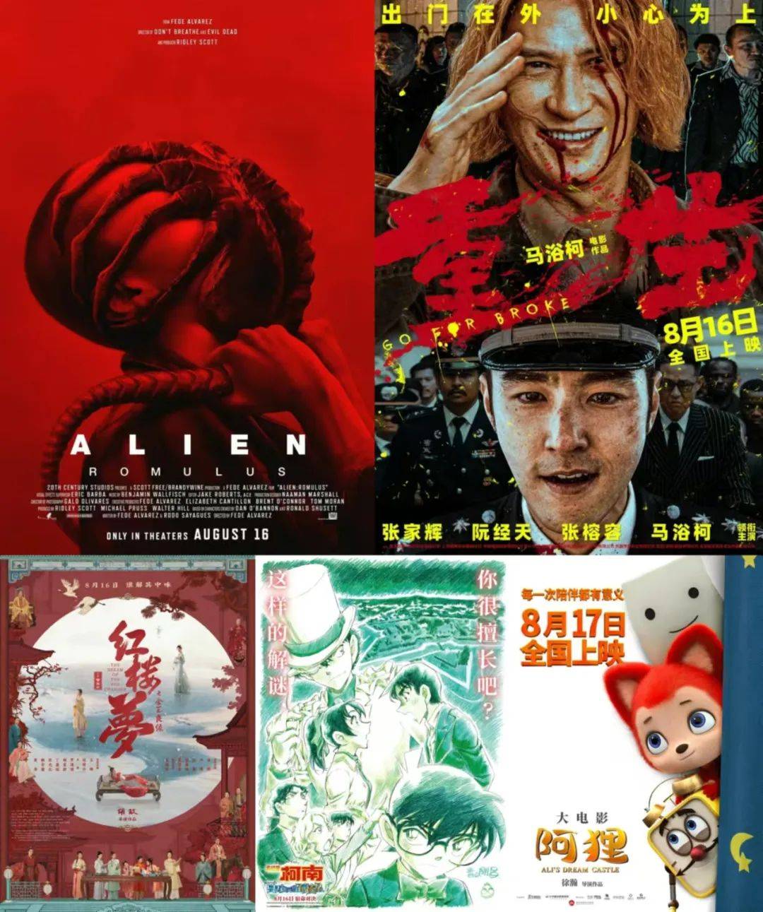 本周公映新片内容丰富。好莱坞经典科幻惊悚IP的续作《异形:夺命舰》和柯南第27部剧场版《名侦探柯南:百万美元的五棱星》是两部重磅引进片;国产片中,张家辉和阮经天主演的犯罪警匪猛片《重生》,搁置五年的名著改编电影《红楼梦之金玉良缘》,以及可爱表情包的衍生动画电影《阿狸》也将上映。