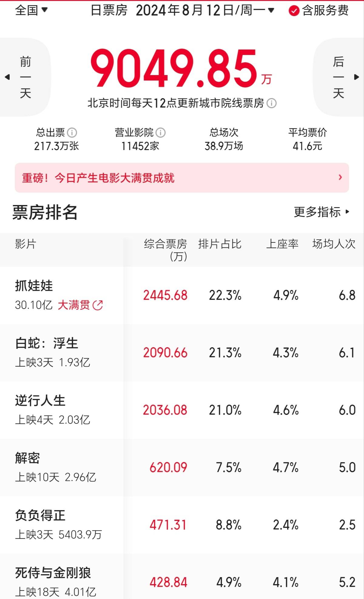 搜狐娱乐讯 (哈麦/文)现在暑期档是《抓娃娃》《白蛇:浮生》《逆行人生》三部电影在主导市场,这三部片排片、上座率、日票房差距不大,《抓娃娃》略领先,排在第一,《白蛇:浮生》《逆行人生》日票房非常接近。