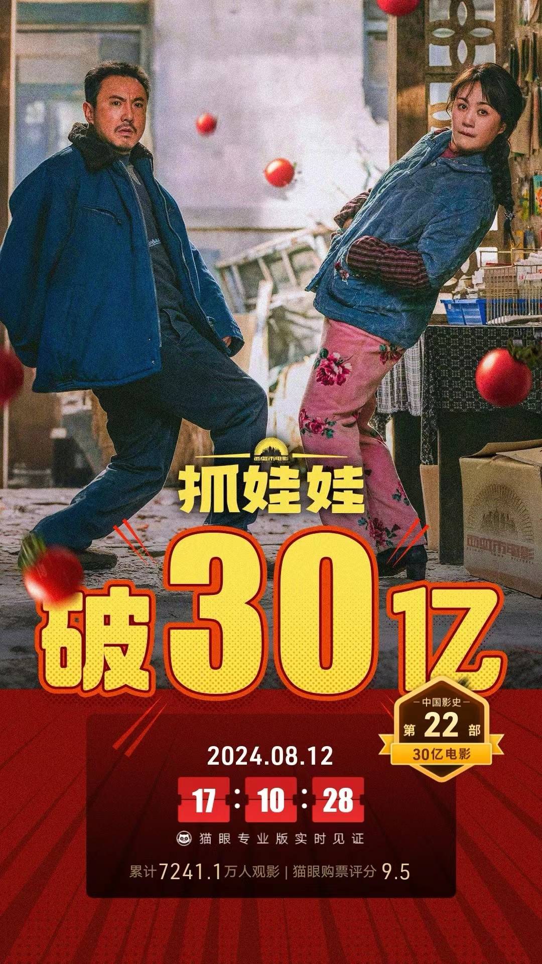 搜狐娱乐讯 据猫眼专业版数据,截至8月12日17:10,沈腾、马丽主演喜剧电影《抓娃娃》上映第28天 ,累计总票房破30亿。累计观影人次7241.1万。成为中国影史第22部破30亿的电影。