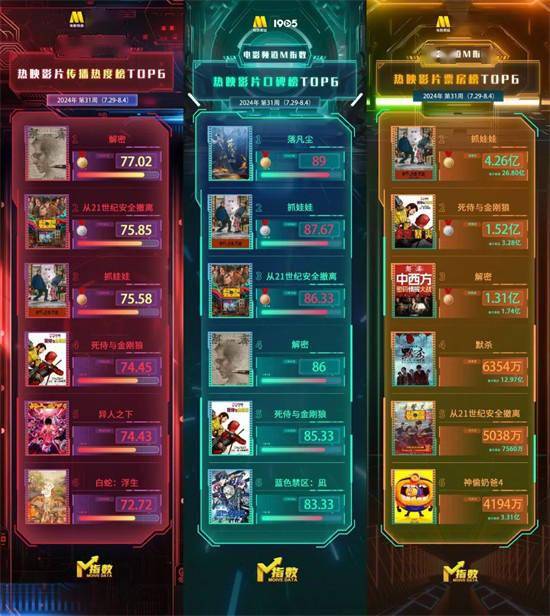 最新发布的本期“电影频道M榜”,关注2024年第31周(7月29日至8月4日)中国电影市场、传播及口碑表现。其中,暑期档票房领跑者保持强劲势头,以4.26亿的周票房佳绩继续领跑热映影片票房榜,、广受观众欢迎的喜剧表演,也令影片同时位列口碑榜第二位及传播热度榜第三位;作为最新的艺术与技术表达力作,新鲜上映的电影以77.02分斩获传播热度榜冠军,其首周票房表现位列第三位;尽管已临近下映,但动画电影还是以出众的国风表达,连续两周领跑热映影片口碑榜。