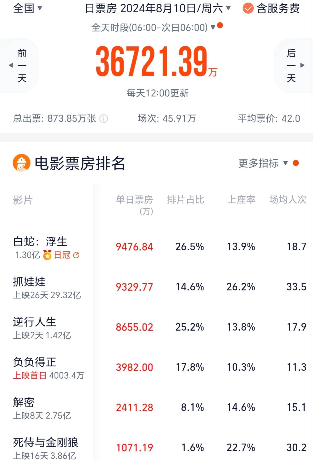 搜狐娱乐讯 (哈麦/文)8月10日七夕节,全国电影票房3.67亿元,比《孤注一掷》上映的去年同期平常周六落后约8000万元,基本与去年落在工作日的七夕票房(3.63亿)持平。