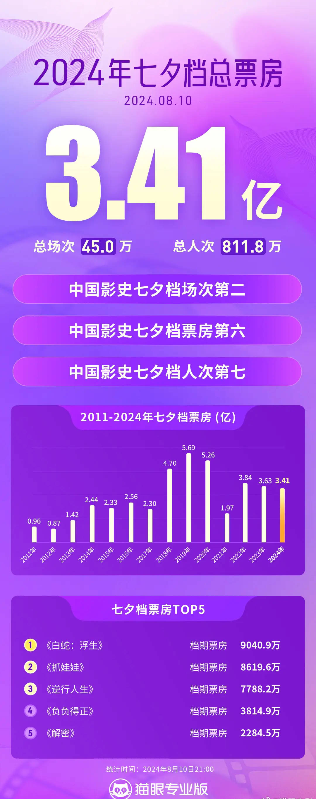 搜狐娱乐讯 据猫眼专业版数据,截至8月10日21时,2024七夕档总票房突破3.41亿,观影人次达811.8万人,放映场次45.0万场。《白蛇:浮生》暂列七夕档票房榜首位!