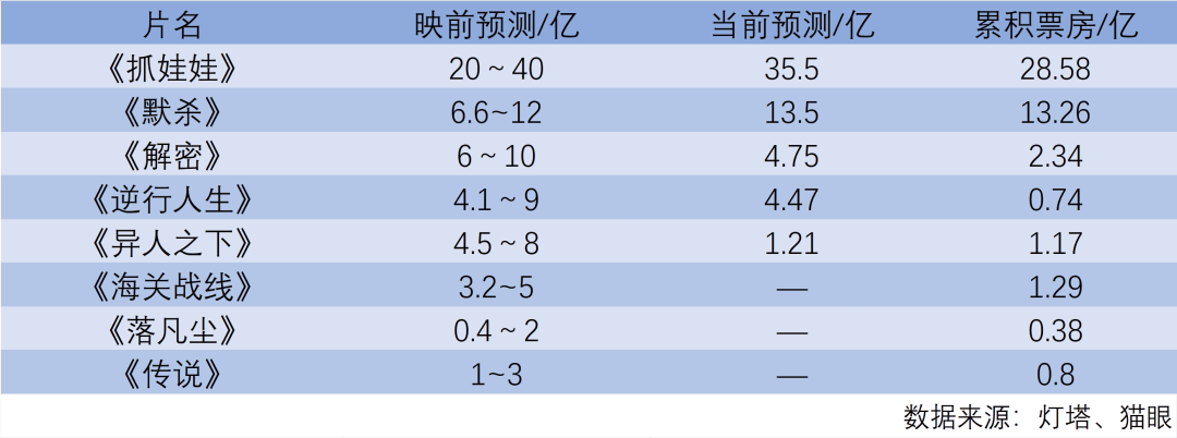 目前暑期档达到票房预期的只有《抓娃娃》和《默杀》,其余票房成绩都在5亿人民币以下。邱礼涛《海关战线》、乌尔善《异人之下》、陈思诚《解密》,前期预测和实际表现都落差很大。