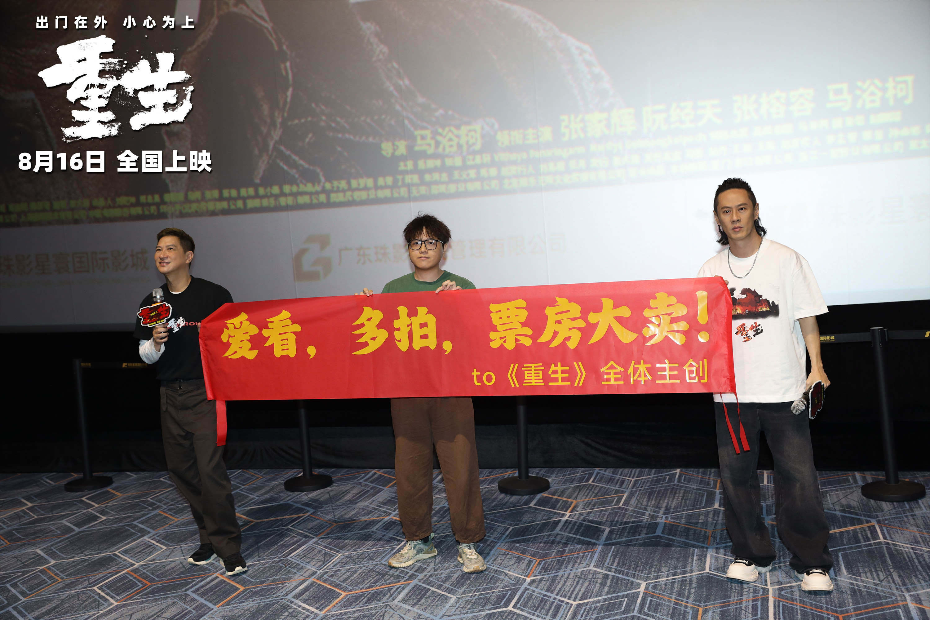 8月9日,导演、编剧、领衔主演马浴柯,领衔主演张家辉来到广州,开启《重生》路演首站,与大家分享电影幕后细节,两位主创现场发放趣味“重生安全宝典”,并设置安全知识小测验,与当地观众热情互动。全国首批观影观众纷纷称赞“剧情多重反转、枪战打斗等大场面过瘾、危险在身边的情感共鸣很强”。