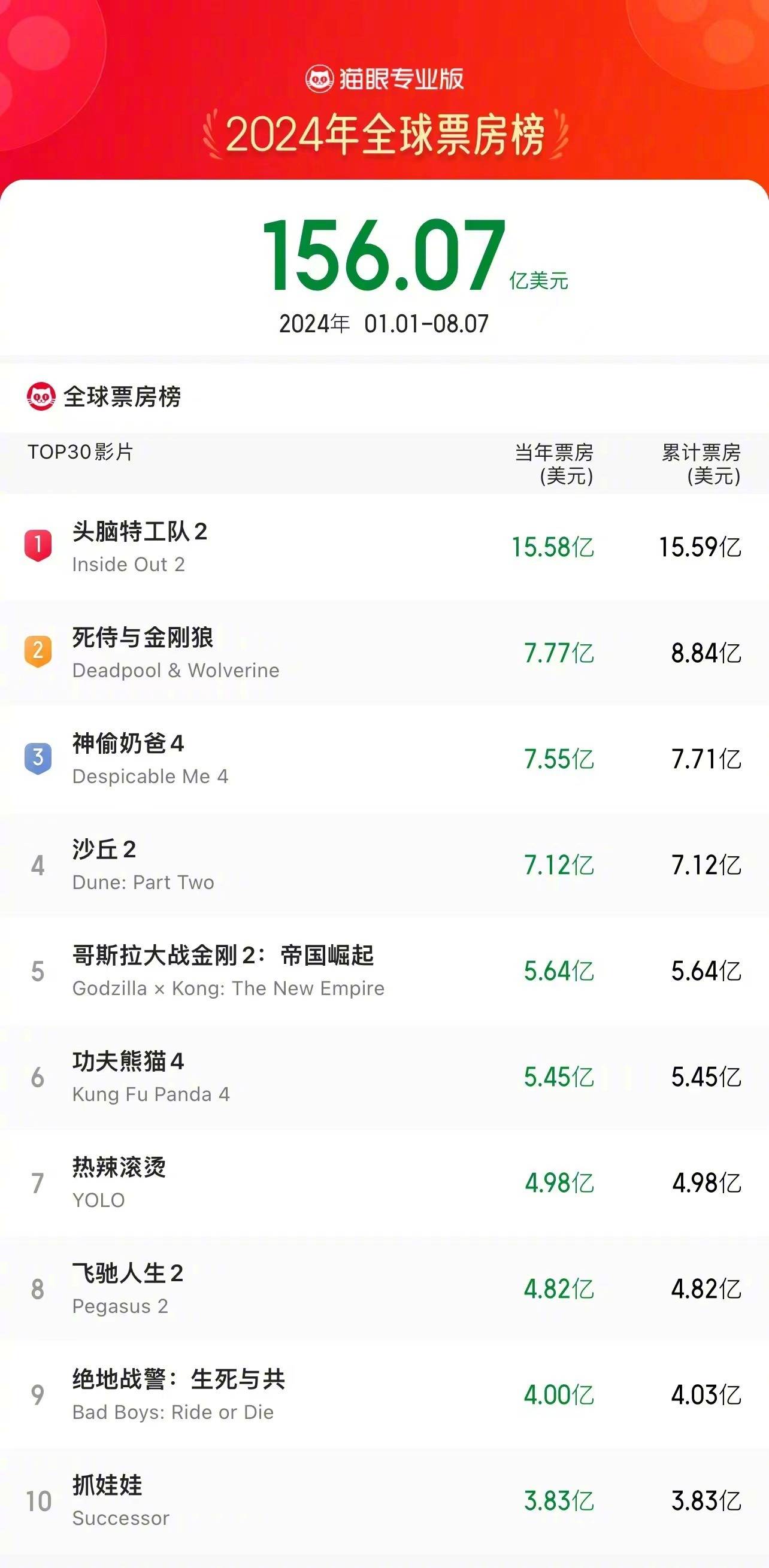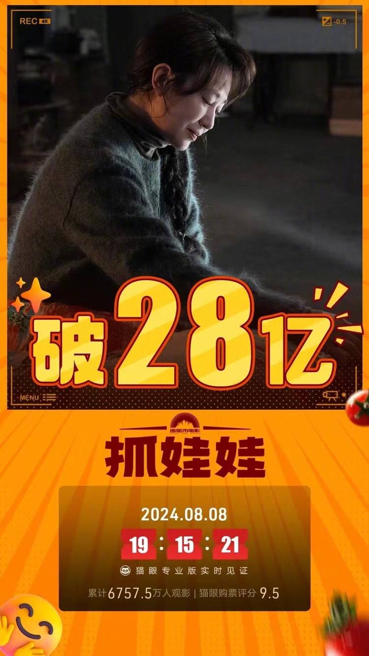 搜狐娱乐讯 据猫眼专业版数据,截至8月8日19:15,沈腾、马丽领衔主演暑期档喜剧电影《抓娃娃》中国内地累计票房超28亿人民币(约合3.9亿美元),进入2024年全球票房榜第十。