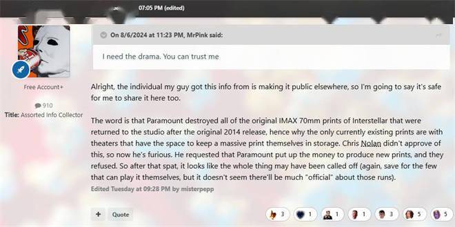 据该帖称,早在2014年首轮放映后,派拉蒙就将放映完毕后的原始胶片拷贝进行了销毁,目前只有少数还存放着胶片拷贝的影院具备放映能力。而影片导演诺兰起初并不知道此事,如今他非常愤怒,并要求派拉蒙重新制作胶片拷贝,但遭到了派拉蒙的拒绝。此次重映原本计划以70mm Imax胶片格式重映,但根据这则消息,整个重映计划将不了了之。