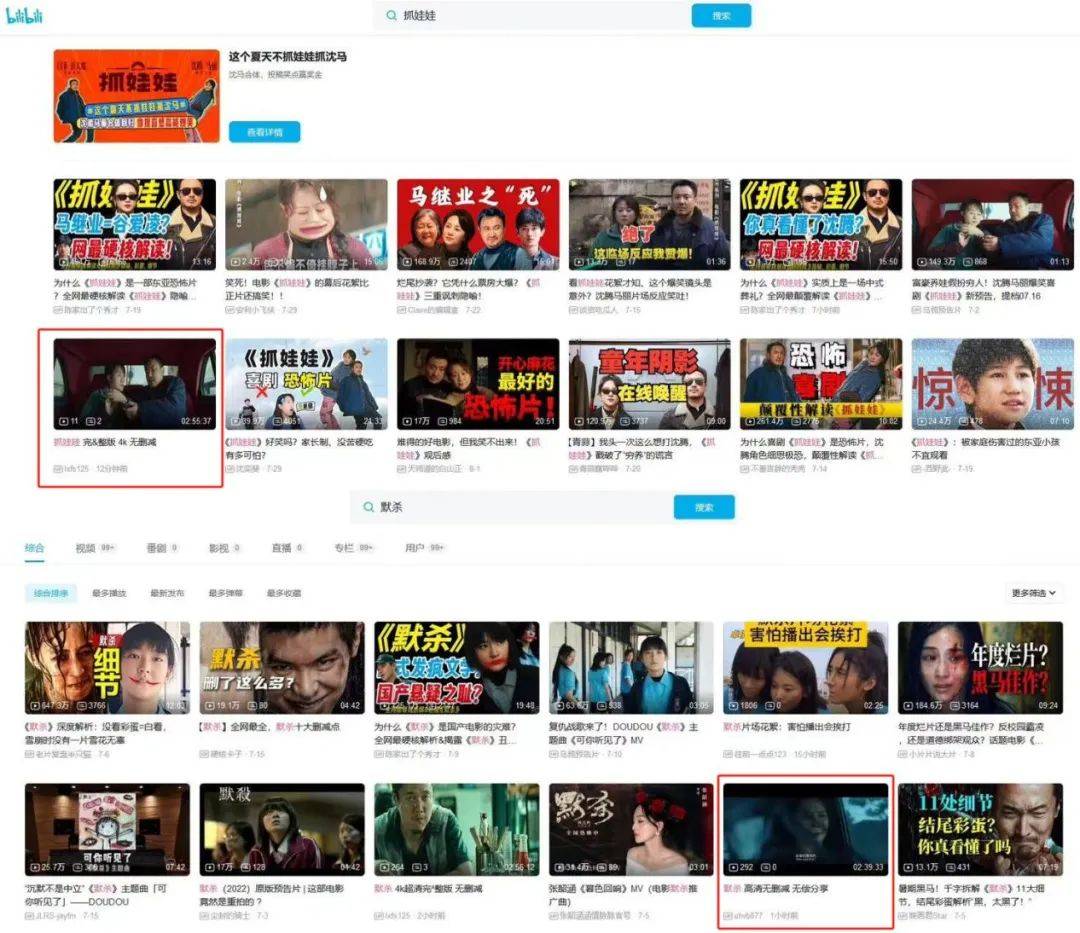 犀牛君在B站首页搜索关键词时,发现除了《21世纪》《死侍3》之外,像《默杀》《抓娃娃》等暑期档热门影片也都存在盗版资源释出情况。这些盗版资源甚至都出现在搜索页前排,甚至与片方合作内容相邻(站方会陆续进行下架处理,但上传资源者此起彼伏)。