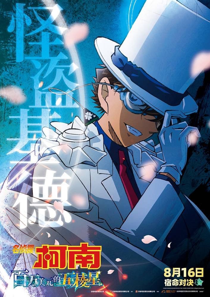 随角色海报同步释出的还有“月下对决”版预告。向来只对大宝石感兴趣的怪盗基德预告函声称将盗走一把刀,引起了柯南的疑虑。月夜之下,关西名侦探服部平次骑摩托车冲上屋顶,拔刀拦住即将逃走的怪盗基德。五棱星的图案、神秘的面具人、十字型的刀痕……一把刀引发了连锁的神秘案件,也引发了多方势力争先恐后上前争夺,这刀上究竟藏着什么秘密?而在预告最后,随着服部平次的关键一击,基德的帽檐被意外划开,露出的脸庞让平次大吃一惊,基德的真实身份是否会曝光?众多谜团亟待8月16日影院揭晓!