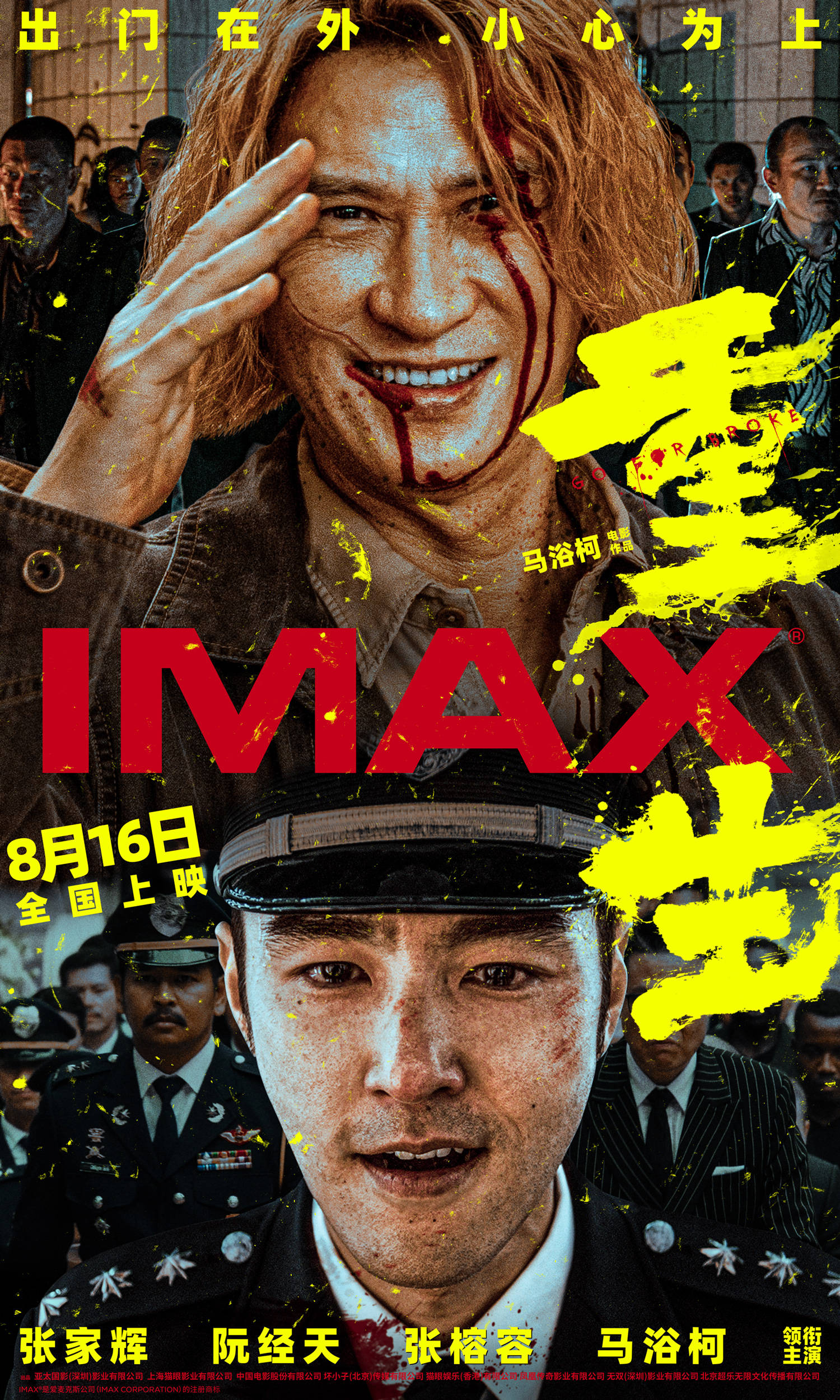 影片IMAX专属海报同日发布。海报上方,张家辉脸上布满血迹,微笑中透着冷酷和深不可测的野心,半举手臂仿佛在敬礼,宣告即将迎来的危机与挑战,彰显出其他这场阴谋局中局中的果敢与勇气,而海报下方的阮经天身着警服,目光如炬,身后的警察队伍整齐划一,体现了法律与秩序的坚定捍卫者形象。“重生”二字以鲜明的黄色呈现,与IMAX的红色标志形成对比,象征着从黑暗中崛起的希望与力量。