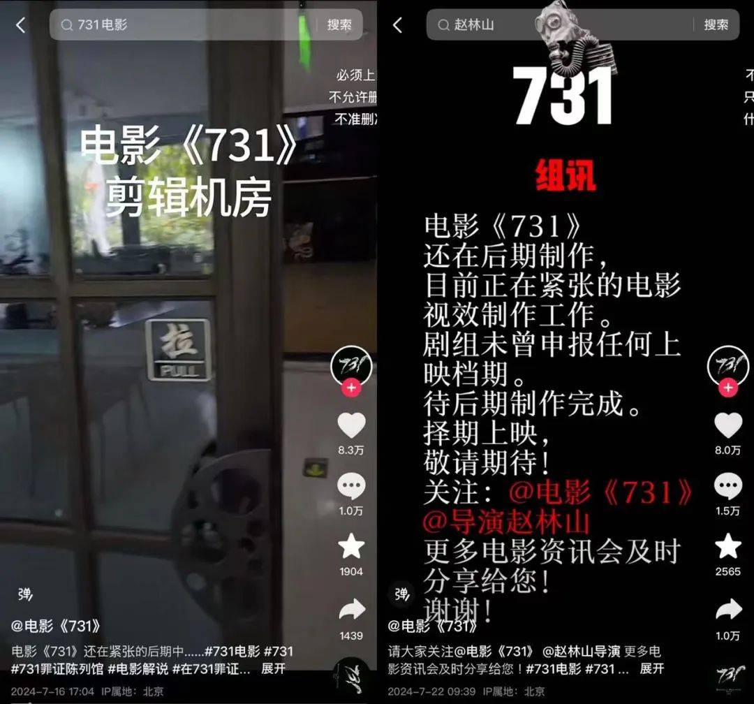待时间来到7月中旬左右,网上有关《731》被举报的谈论声激增,衍生出“上百万条举报”、“理由是过于血腥恐怖”等多个传言版本。在为相关博主带来巨大流量的同时,由于谣传内容过多也引来片方的解释声明,分别在7月16日和7月22日发布抖音内容表示影片还在后期制作中,当下尚未申报任何上映档期。