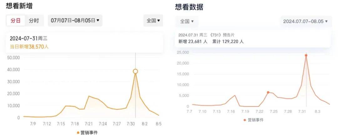而借着这波热度,片方在官抖上陆续释出了两则预告片段。不过比起流出正片内容本身,显然还是争议声带来的传播效果更佳。随着时间临近,网友对《731》的关注度进一步抬升,并在7月31日当天达到峰顶。