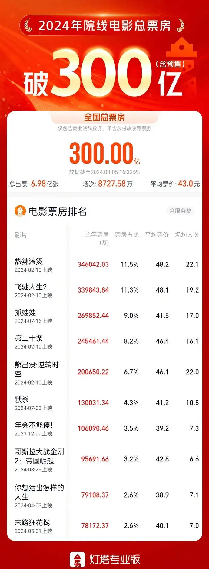 搜狐娱乐讯 据灯塔专业版数据,截至8月5日16时32分,2024年度院线电影大盘票房(含预售)突破300亿!《热辣滚烫》《飞驰人生2》《抓娃娃》《第二十条》《熊出没·逆转时空》《默杀》《年会不能停!》《哥斯拉大战金刚2:帝国崛起》《你想活出怎样的人生》《末路狂花钱》位列档期票房前十。