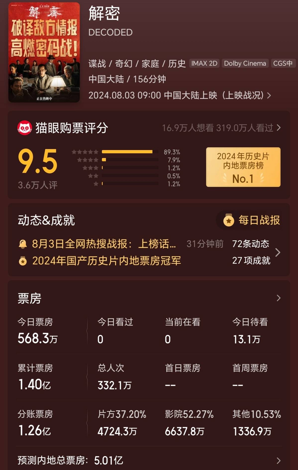 口碑方面,《解密》在影迷聚集的豆瓣评分6.9分,在大众购票平台猫眼评分9.5分,超过不少陈思诚的其他作品。按首日开局,猫眼专业版预测《解密》最终总票房约5亿元。