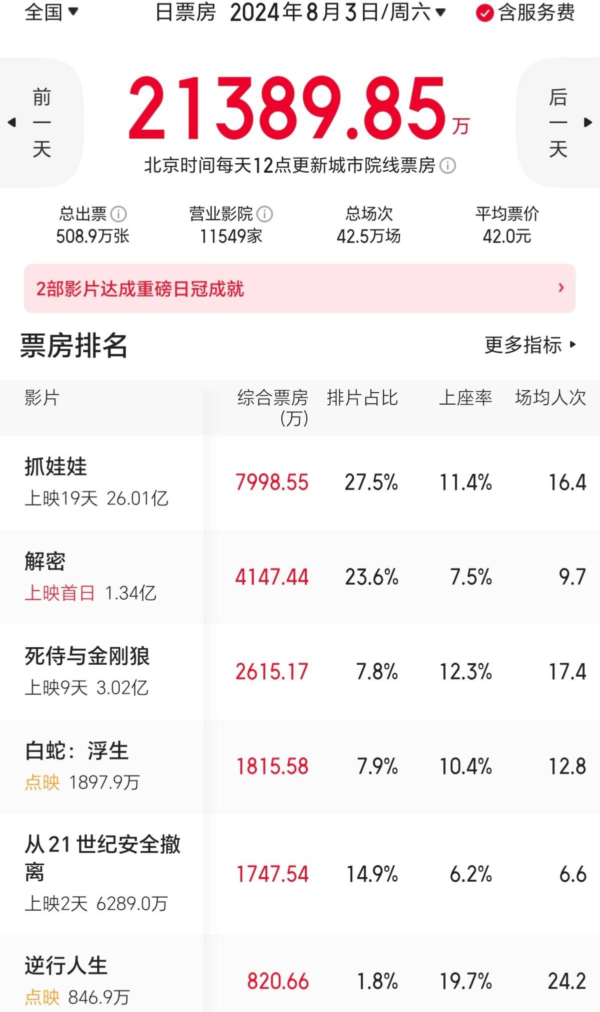 《解密》表现并不算强势,首日上座率7.5%,远不如老片《抓娃娃》的11.4%和《死侍与金刚狼》的12.3%,也不如点映的新片《逆行人生》《白蛇3》,只比另一部新片《从21世纪安全撤离》高一点。
