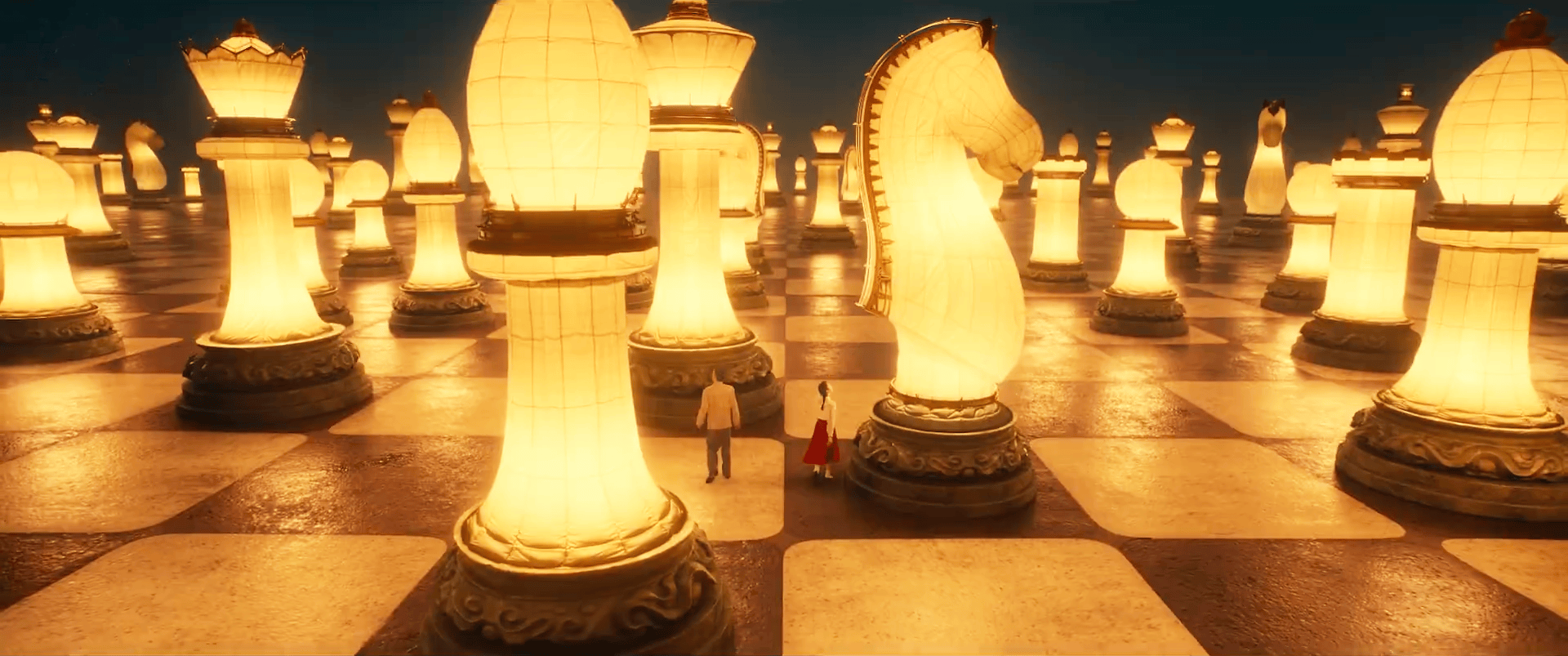 开头,师徒二人下棋,老师偷走了一枚棋,为后面的故事埋下了伏笔。