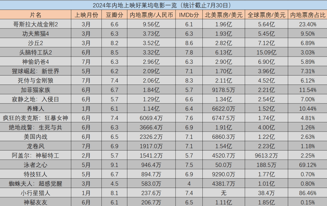 像主打视听风格化的末世科幻片《疯狂的麦克斯:狂暴女神》,在内地就很难再吃得开。就算是豆瓣和IMDb双8分的“太空歌剧”《沙丘2》,在内地的表现也并不亮眼。这部电影在中国内地的票房,甚至还不如在英国的票房。