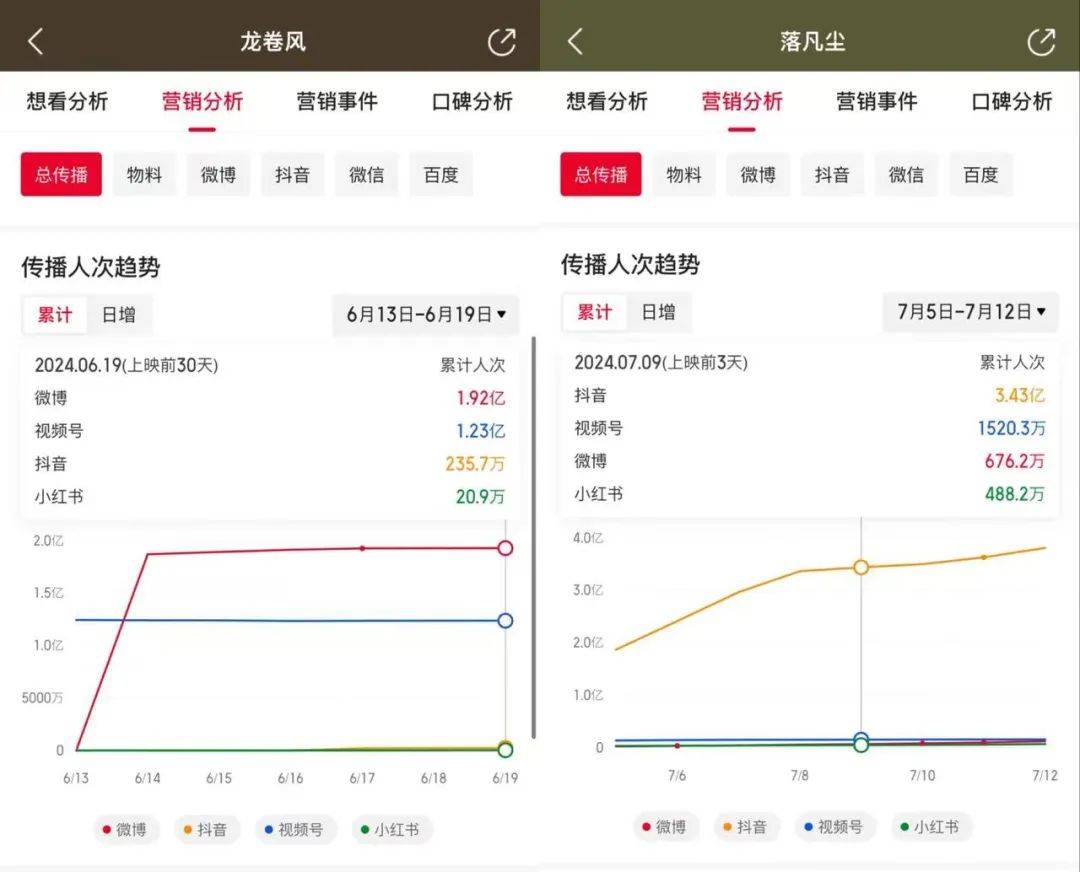 暑期档的动画片《落凡尘》也是如此。映前一周,它在全网的整体营销数据,甚至比不上外片《龙卷风》的同期数据。
