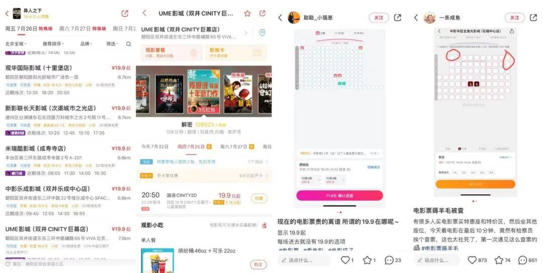 首先,很多影院都推出了阶梯式售票,不同区域的座位是不同票价。虽然很多电影院显示最低票价19.9元,但你点进去,会发现只有四周偏远的座位是19.9元,核心区的座位票价依然很贵。有北京观众吐槽,有的影院还惊现查票员,买了低价区票的观众不能薅羊毛坐到高价区。