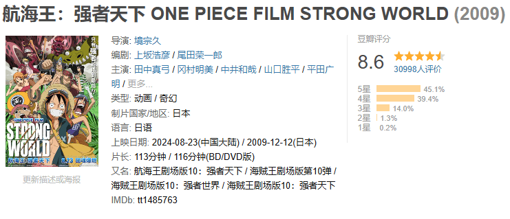 另一部是《海贼王》剧场版的第十部:《航海王:强者天下》,于8月23日在国内院线上映。