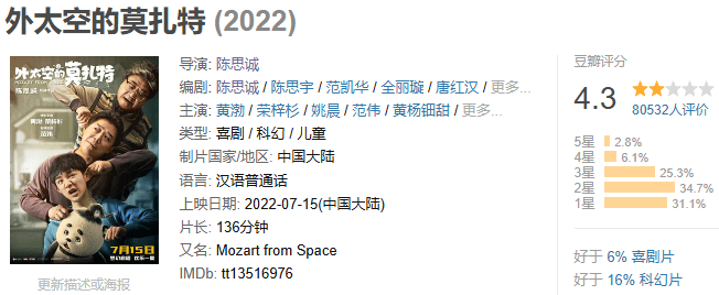 我觉得一般观众都得掂量掂量,毕竟两年前,陈思诚执导的科幻片《外太空的莫扎特》让人大跌眼镜。