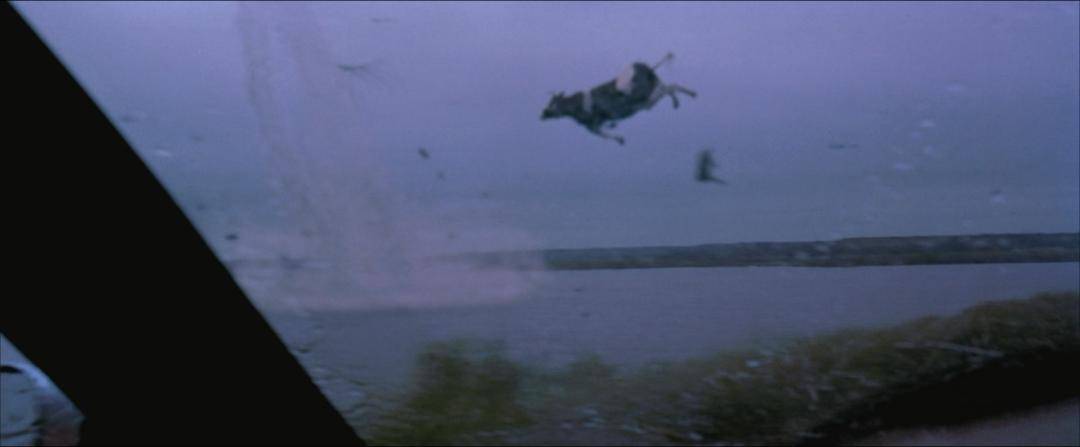 对比96版和新版的龙卷风画面,能看出90年代的特效画面像素较低,CG制作的龙卷风与实景画面能明显看出边界感。即使是片方引以为傲的“飞天奶牛”名场面,也能明显看出CG动画的痕迹。