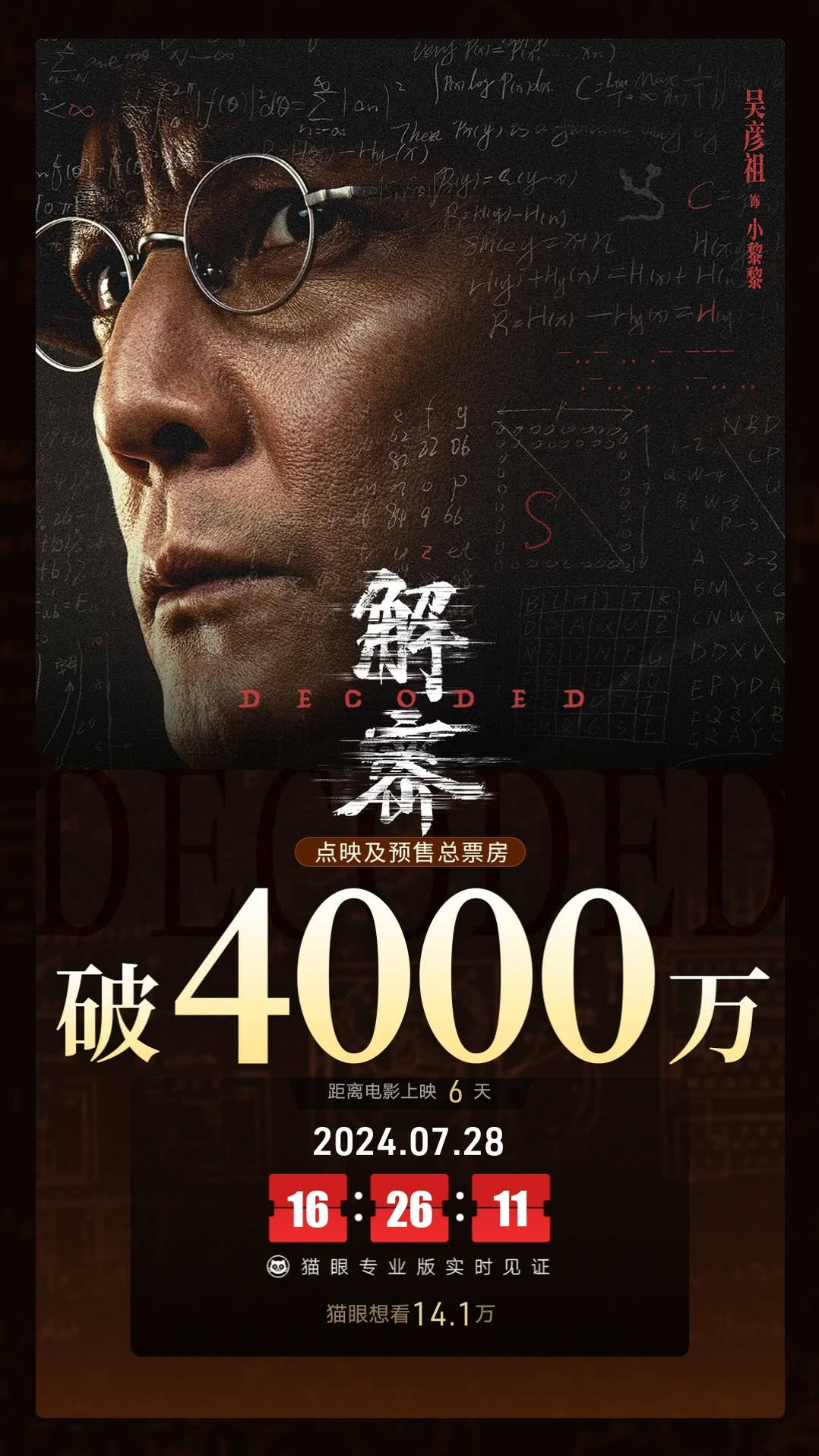 将于8月3日正式上映,由陈思诚执导,刘昊然领衔主演的电影《解密》点映及预售票房收4183.7万排第六;