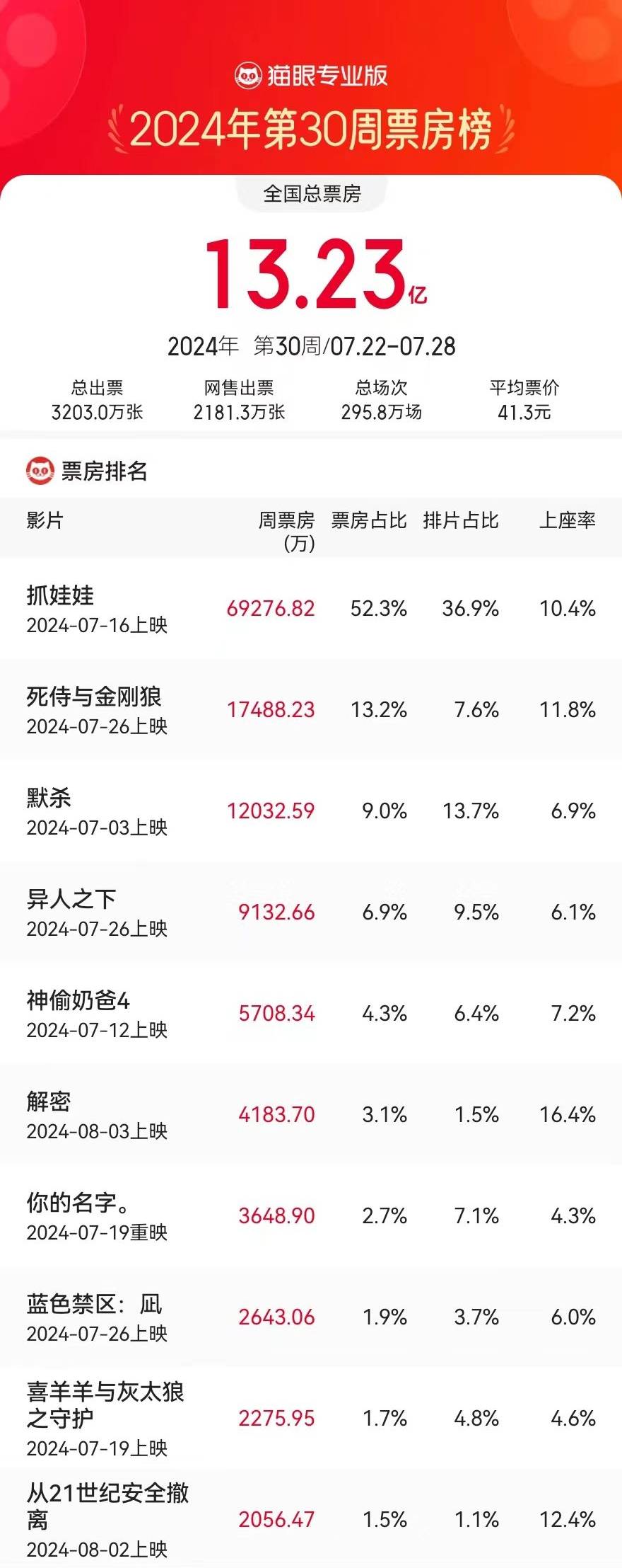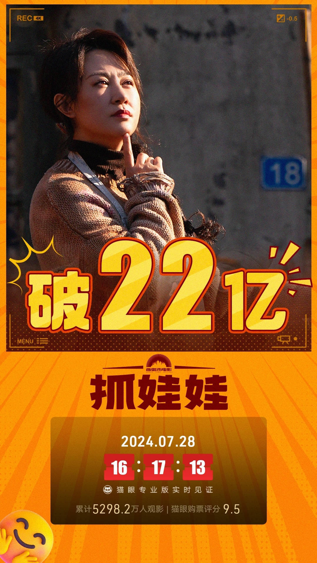 喜剧电影《抓娃娃》上映第二周收6.92亿夺冠,自上周末点映开始已连续16天蝉联单日票房冠军,截至目前,预售加点映累计总票房22.58亿,暂居2024年内地电影票房总榜第四;