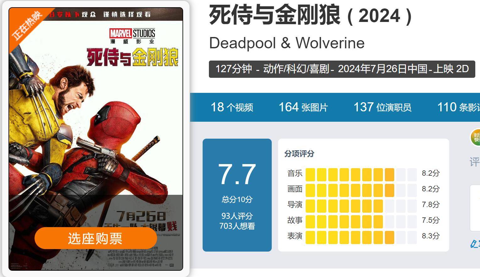 《死侍3》在国内两日票房破1.2亿人民币,预计开画1.6亿人民币,和《死侍:我爱我家》2019年的表现差不多。
