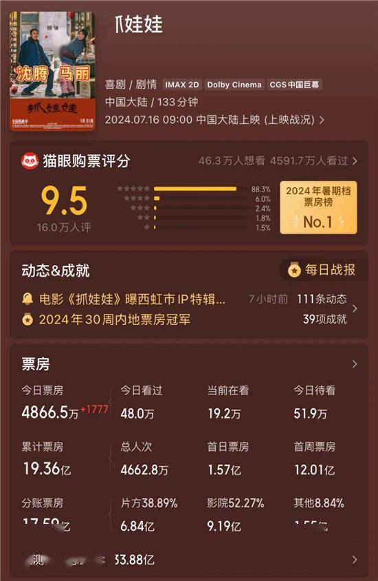 正式上映2天微博热搜话题超300个,累计观影人次破两千万,票房破9亿元,直接跻身2024上半年票房前十。直至今日总票房累计19.36亿元,总预测票房已高达33亿元。观影热潮背后,究竟“抓”住了怎样的“流量密码”?