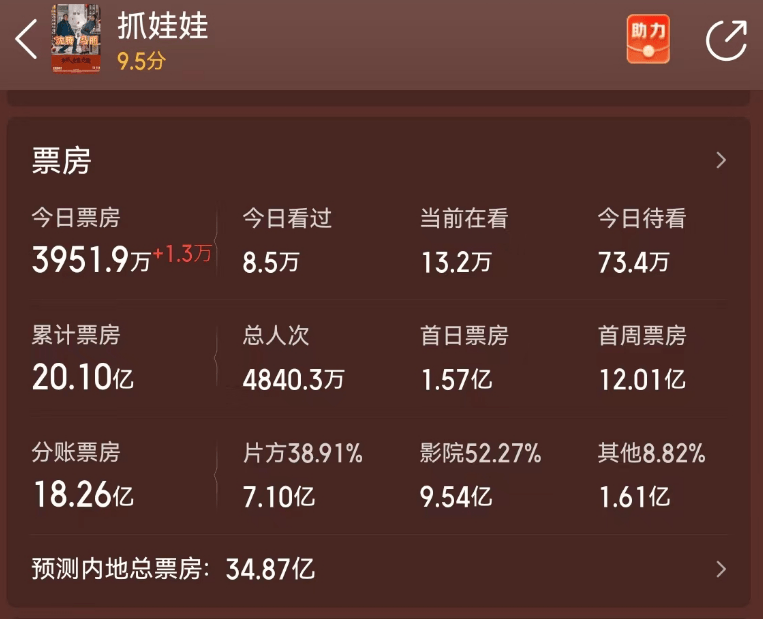 截至发稿,上映12天的《抓娃娃》票房迈过20亿大关,片方分账达到7.1亿,赚得盆满钵满。