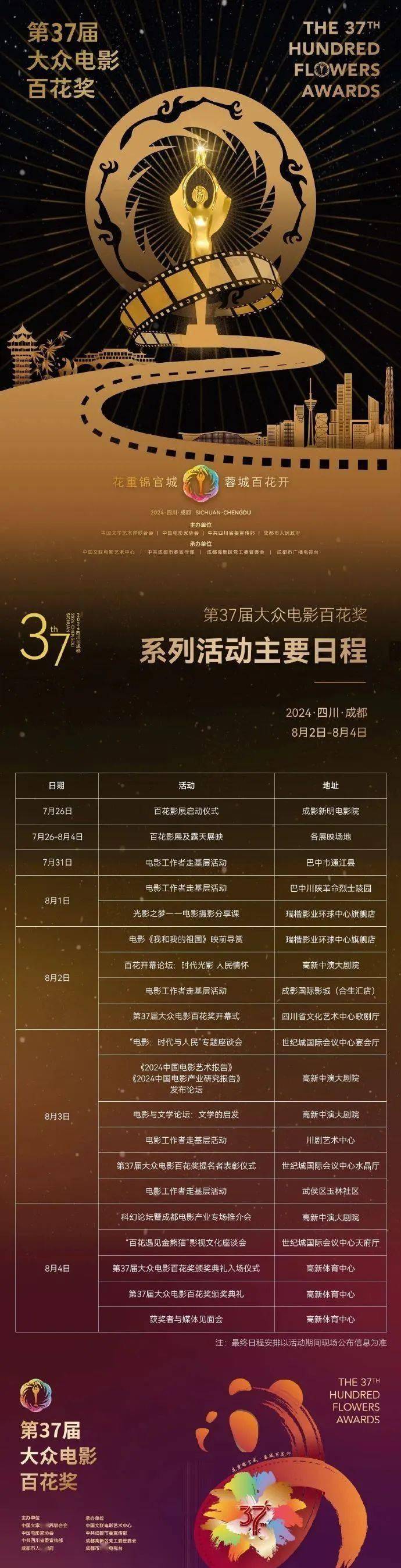 第37届大众电影百花奖系列活动主要日程发布。其中,包括了百花奖终评、开幕式、提名者表彰仪式、颁奖典礼、影片展映、“百花遇见金熊猫”影视文化座谈会等12项活动。届时,提名代表、观众评委、论坛及影展嘉宾等将出席活动。本届百花奖将于8月2日-8月4日在四川成都举办。