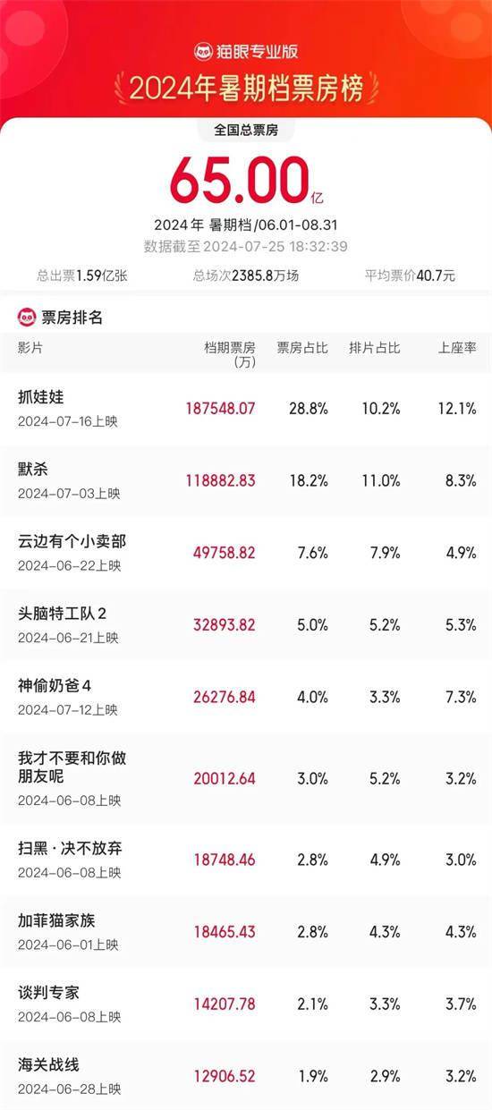 1905电影网讯据票务平台数据统计,截至7月25日18时32分,2024年暑期档(6月至8月)电影总票房(含预售)突破65亿元。其中,,暂列档期票房榜前三位。