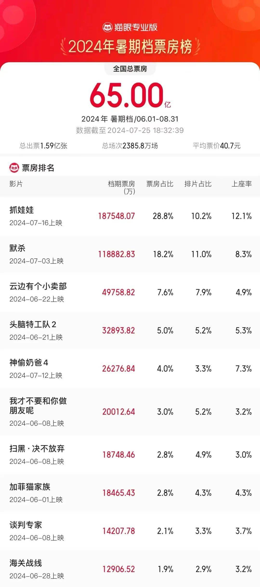 据票务平台数据统计,截至今天(25日)18时32分,2024年暑期档(6月至8月)电影总票房(含预售)突破65亿元。其中,《抓娃娃》《默杀》《云边有个小卖部》,暂列档期票房榜前三位。