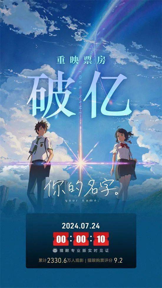 截至目前,《你的名字。》重映票房突破1亿,内地累计票房已达到6.76亿。影片由新海诚导演,神木隆之介、上白石萌音、长泽雅美等献声出演,讲述了巫女世家出身的高中女孩宫水三叶(上白石萌音 配音)和住在东京的高中男孩立花泷(神木隆之介 配音)在梦中交换了身份的故事。影片曾于2016年在中国内地首映,并收获了5.64亿的票房。
