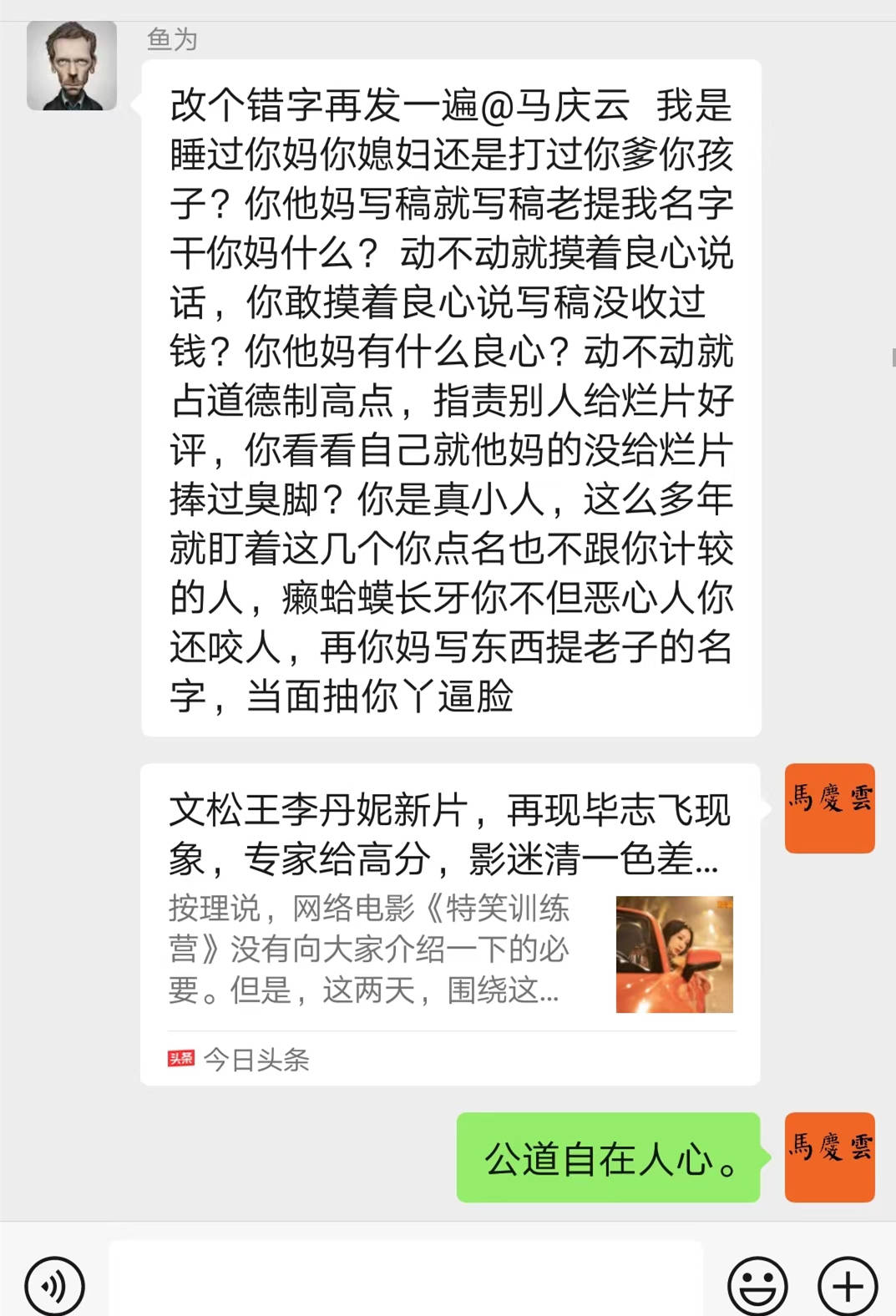 然而,在7月23日早晨,也就是那篇论证文章发布3天之后,一位名为“鱼为”的电影“专家”,在我所在的群组当中开启了谩骂模式,谩骂内容,不堪入目。我便奇怪了,这位电影“专家”鱼为老师,怎么给《特笑训练营》这部电影高分,还怕人提了呢?