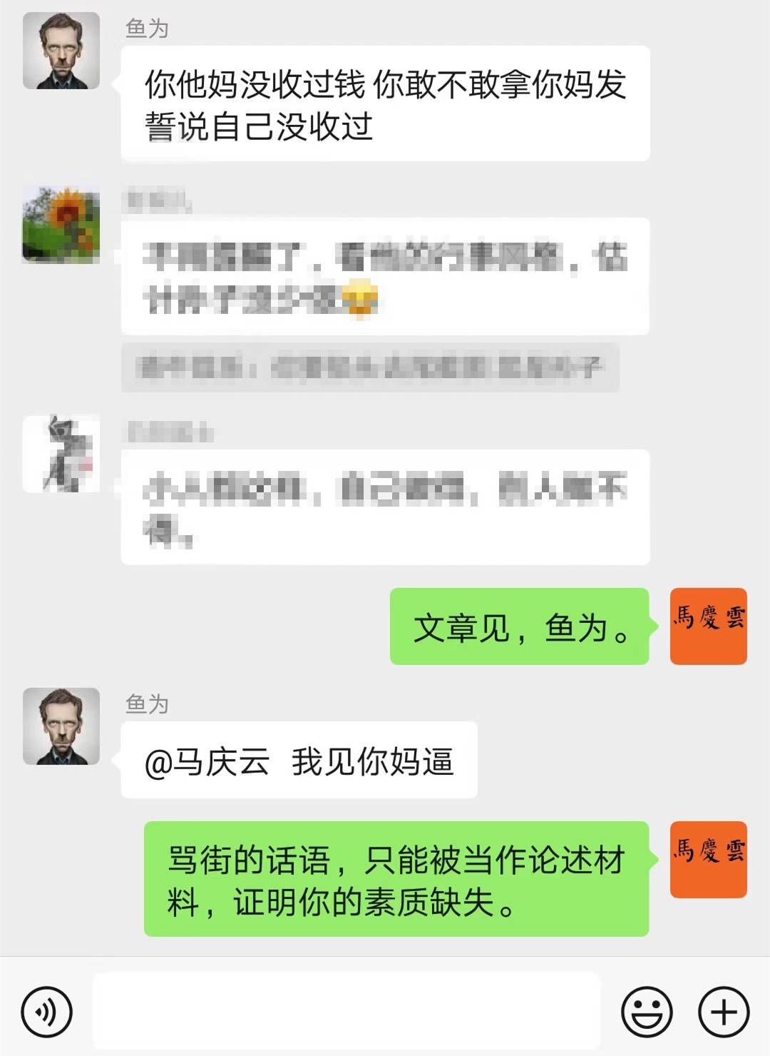 你……(不文明用语,笔者删除,太没素质,不便公开)没收过钱……(后续又是不文明发言,删除,免得污染读者的眼睛)。