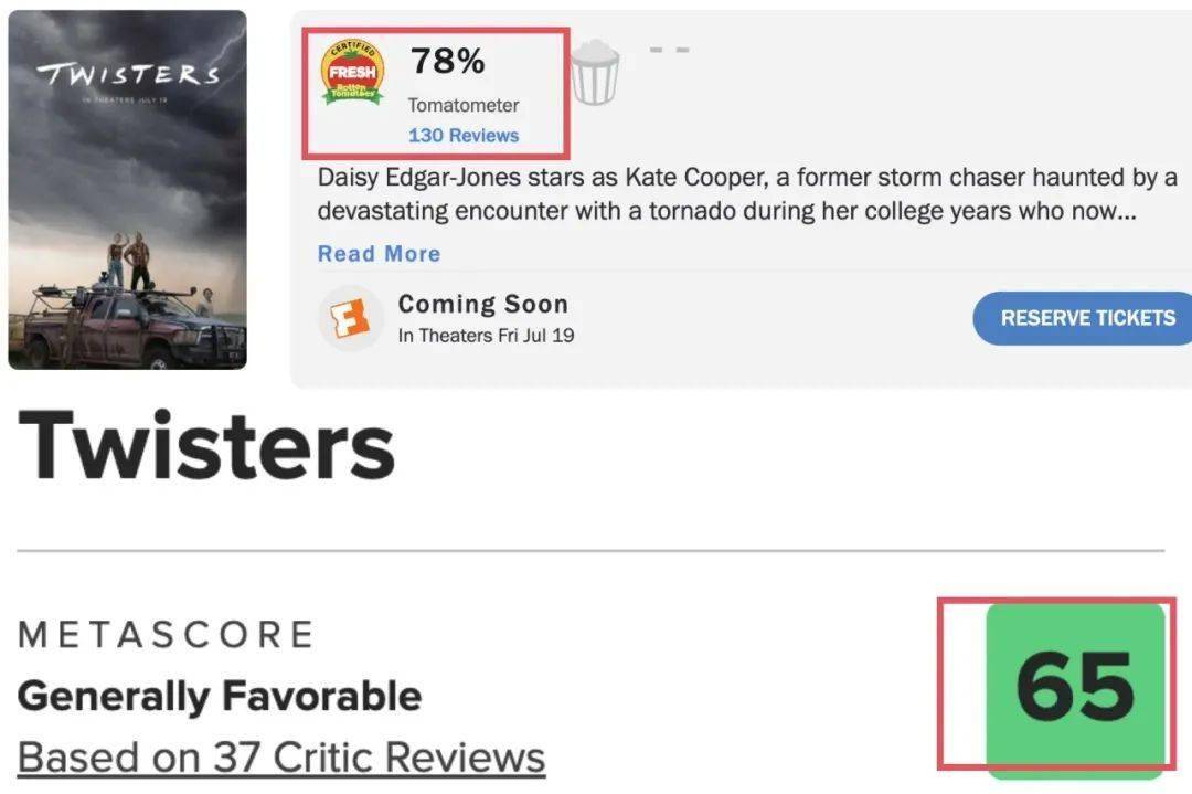 另一部《龙卷风》翻拍自1996年的同名电影,原版电影曾开启了全球灾难片的全盛期。根据票务平台显示,目前新版《龙卷风》想看人数2万余人。这个数据在持续升温的暑期档中虽不突出,但从目前释出的口碑看,烂番茄新鲜度78%,MetaCritic综评65/100,超越了经典灾难电影《2012》和《后天》。