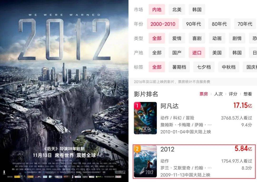其中,对中国市场影响最大的是2009年上映的《2012》。该片占据了当时市场60%以上的排映空间,单日票房占比高达90%以上。根据票务平台统计,在2000年到2010年间,该片位列内地票房榜第四,引进片榜单位列第二,仅次于《阿凡达》。