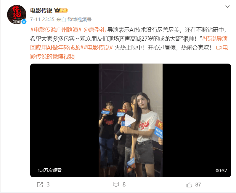 近日,成龙主演的新片《传说》遭遇了口碑和票房的滑铁卢,豆瓣5.4分和上映十余天7000多万的票房成绩,让上半年净亏损1.08亿到1.53亿的博纳影业始料未及。博纳影业今年成立了自己的AI工作室,《传说》上映之前AI技术一直是本片的噱头,上映后却成了观众不买账的地方。博纳影业使用当前热门的AI换脸技术还原了27岁的成龙,在电影中出演量达到了80%,但整体呈现效果有诸多违和之处,观众表示影片中的成龙非常出戏,AI模拟真人表情的效果不到位,给观众造成了恐怖谷效应。