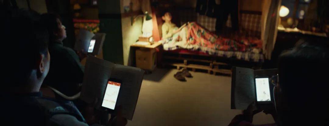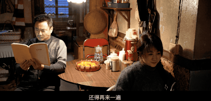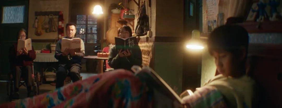 片中有一场戏:老马、春兰和奶奶陪着小马看书,小马是真看书,他们仨却在偷感很重地玩手机,犯困的春兰用头抵住了灯开关,一不小心贴脸关灯。