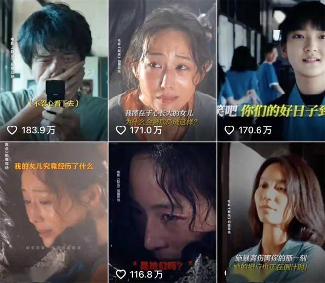 今年的《默杀》同样如此。除了上文提到的犯罪奇观,短视频平台点赞最高的三支视频分别为“得知女儿死亡真相后崩溃”、“看到女儿被霸凌心痛不已”和“面对校园霸凌用另类方式伸张正义”,都是强演技、强情绪和强社会议题的结合体。