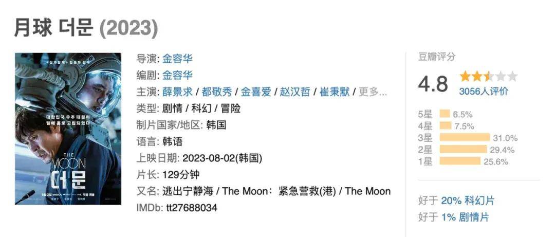 放眼望去韩国电影科幻片少得可怜,能挑出来的大制作如《月球》,豆瓣评分4.8。