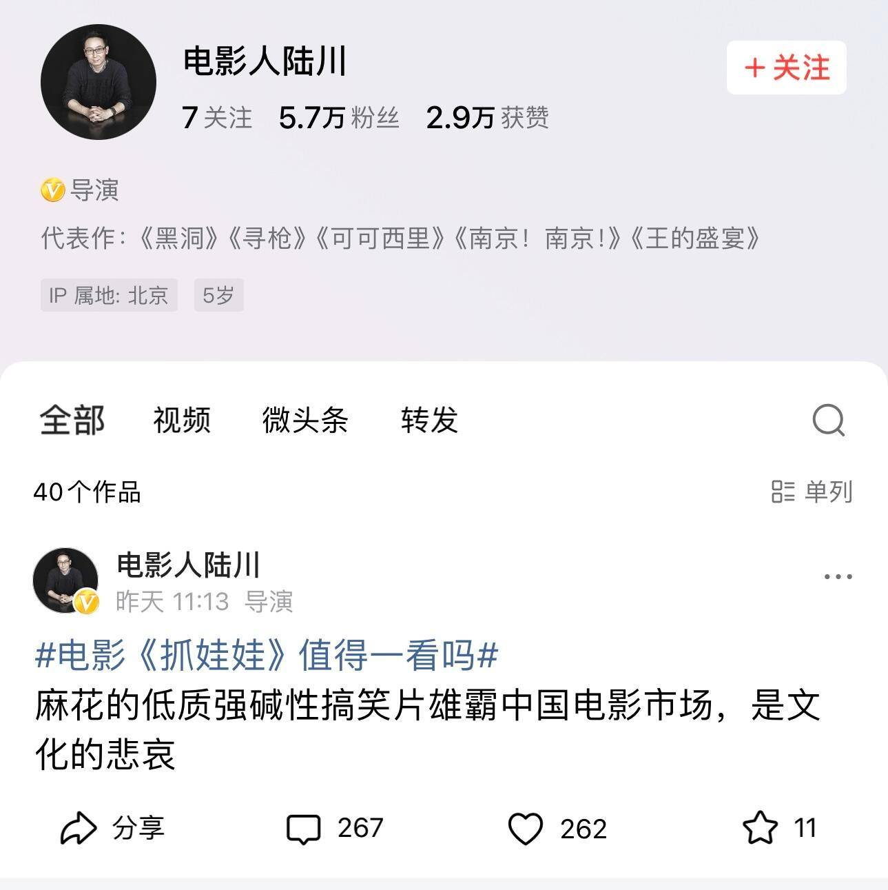 搜狐娱乐讯 7月17日,导演陆川点评沈腾马丽新片《抓娃娃》:“麻花的低质强碱性搞笑片雄霸中国电影市场,是文化的悲哀”,随后秒删。据悉,此前《没有一顿火锅解决不了的事》撤档时陆川也曾转发网友评论阴阳。陆川最新的一部院线电影是《九层妖塔》,豆瓣评分4.4,票房6.81亿,目前待映作品有《749局》。