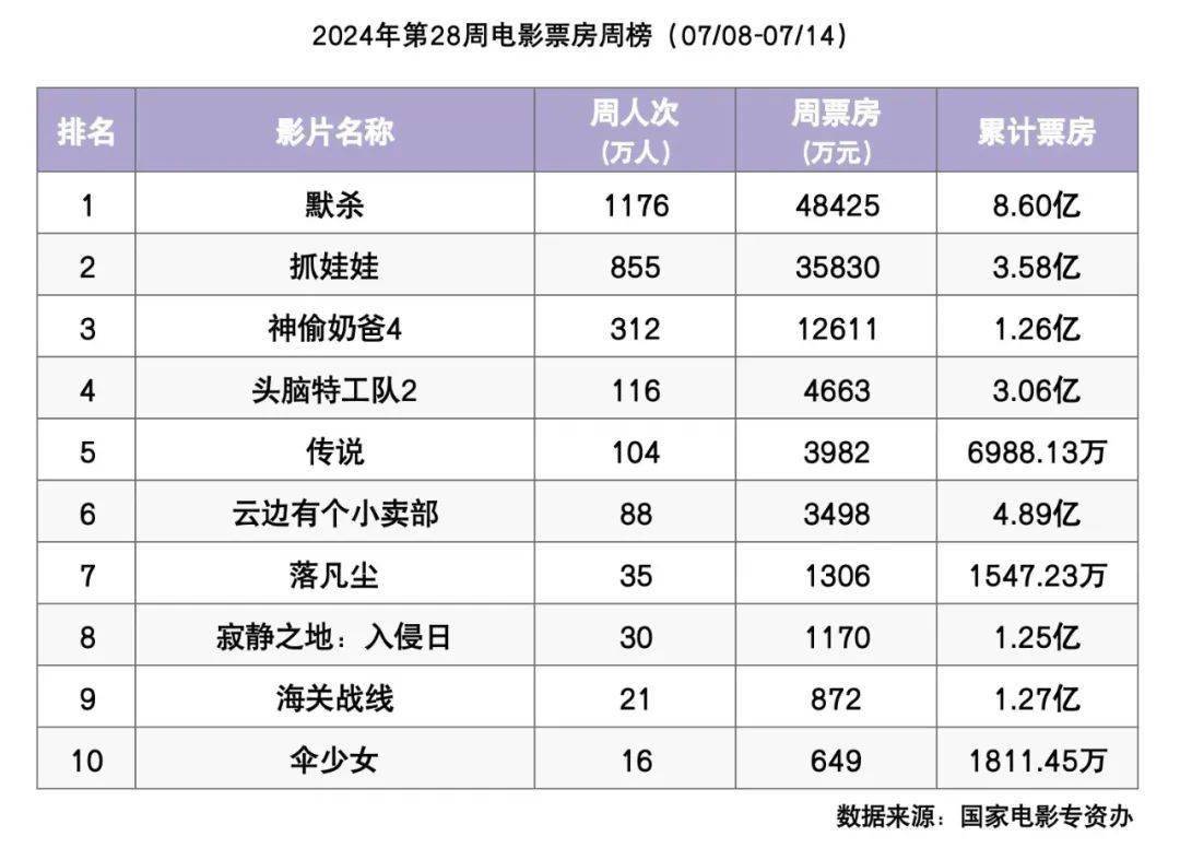 上周(2024/7/8-7/14)全国电影市场共收获11.69亿票房,同比增长51%。7月过半,暑期档逐渐升温。上周票房前三名分别为《默杀》《抓娃娃》与《神偷奶爸2》,连续两周登顶的电影《默杀》凭4.84亿周票房的成绩稳居周榜榜首,贡献了超四成的周票房。截至上周日,该片上映12天,累计票房已达8.6亿元,有望成为今年暑期档首部票房10亿 影片。