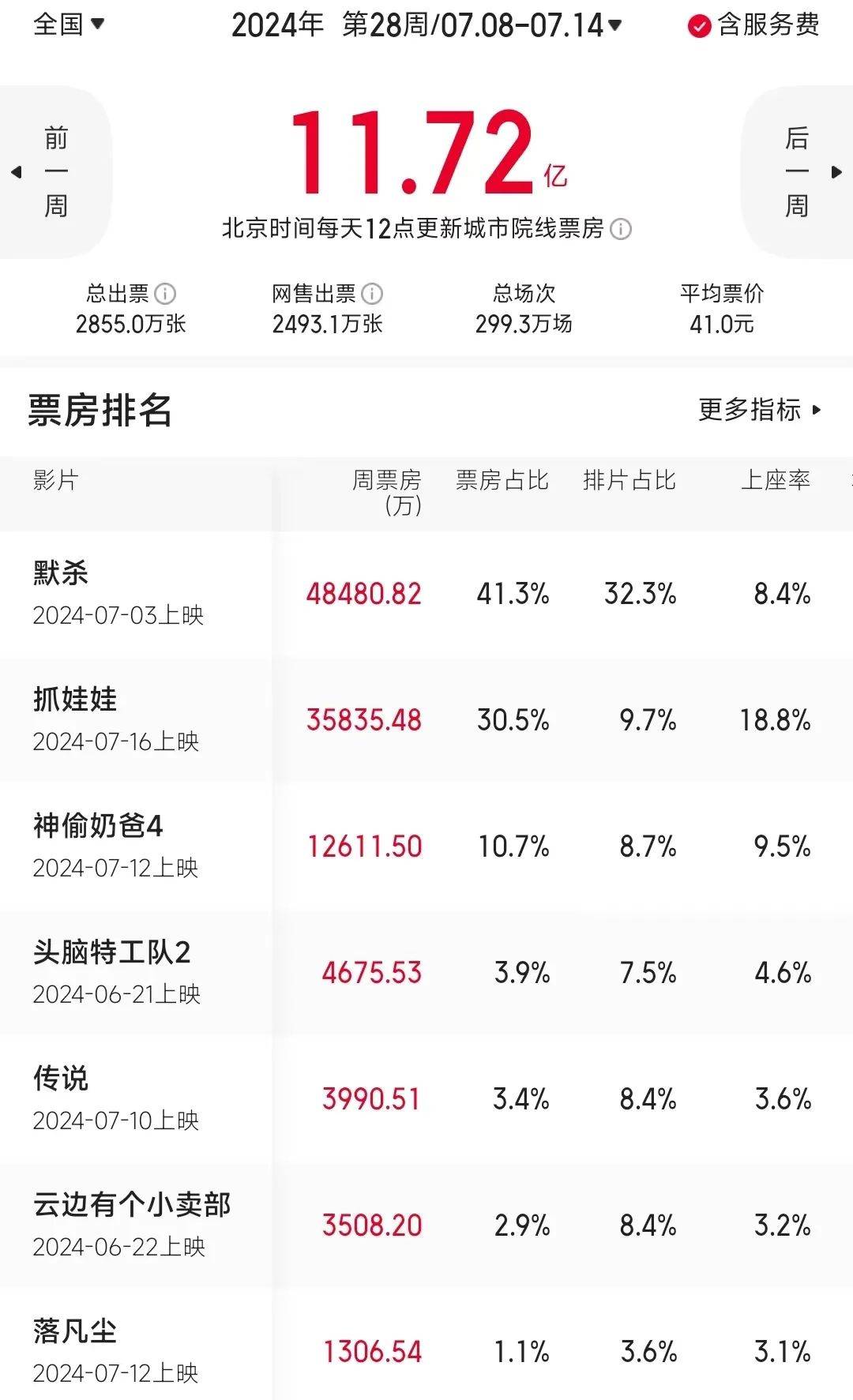刚刚过去的上周末,沈腾和马丽主演的超级喜剧《抓娃娃》点映不出所料票房大爆,预示着暑期档的高潮将要来临。07.08-07.14一周内地票房报收11.72亿,相较前一周的7.75亿增长51.2%,本周二《抓娃娃》正式公映,相比上周,票房大盘将更加火热。