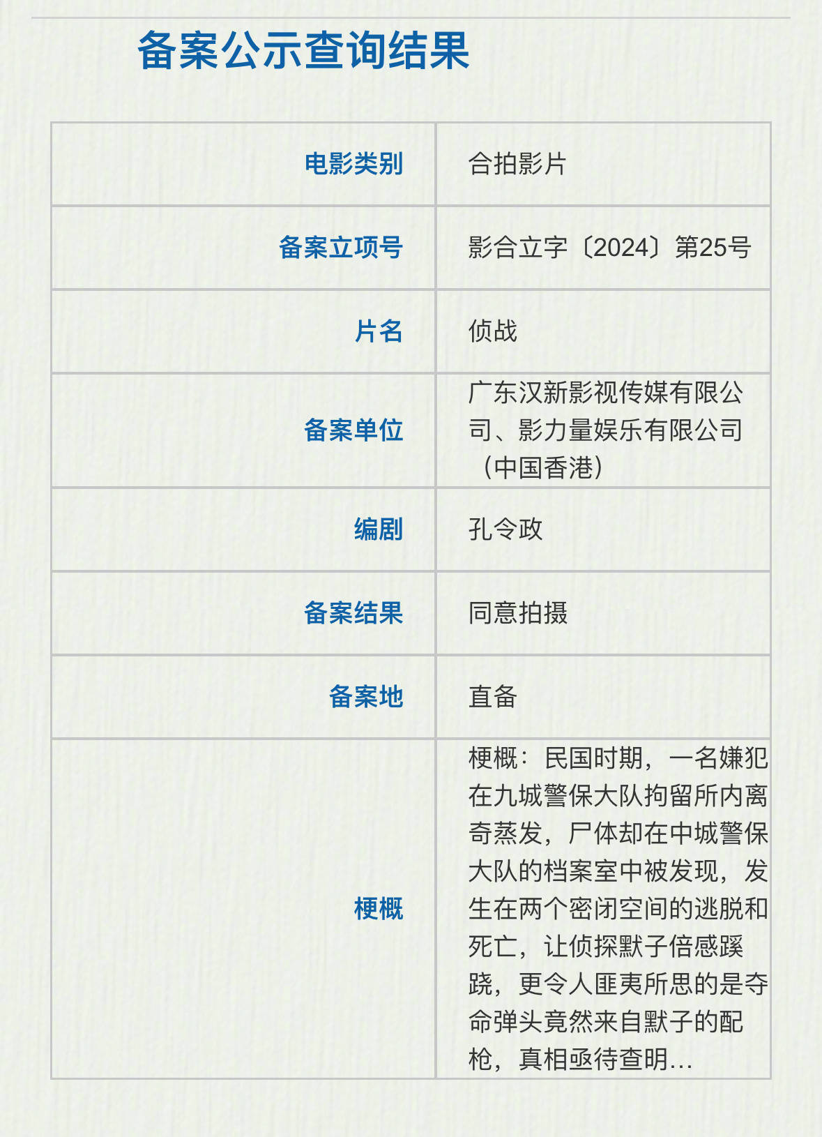 搜狐娱乐讯 据国家电影局关于2024年5月下全国电影剧本(梗概)备案、立项公示的通知,电影《侦战》备案立项。该片为中国内地和中国香港合拍片,由孔令政执导,古天乐、此沙、任达华、谢君豪主演。