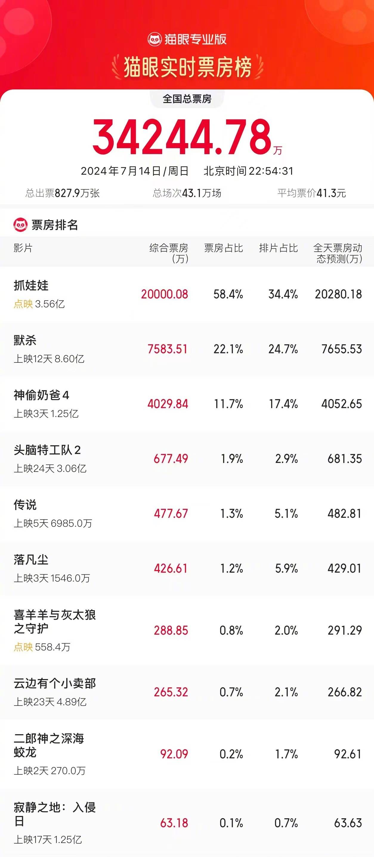 7月13日单日票房超1.5亿,7月14日单日票房破2亿,也是继春节档《热辣滚烫》2月17日上映后,时隔147天大盘单片单日票房再破2亿;