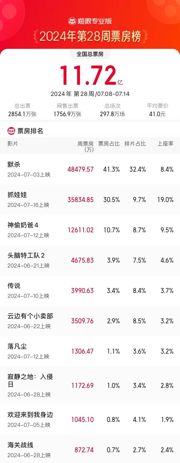 搜狐娱乐讯 据猫眼专业版数据,得益于电影《抓娃娃》点映,7.8-7.14内地一周票房报收11.72亿,较前一周7.75亿大幅上涨51.22%,时隔九周再次突破10亿。