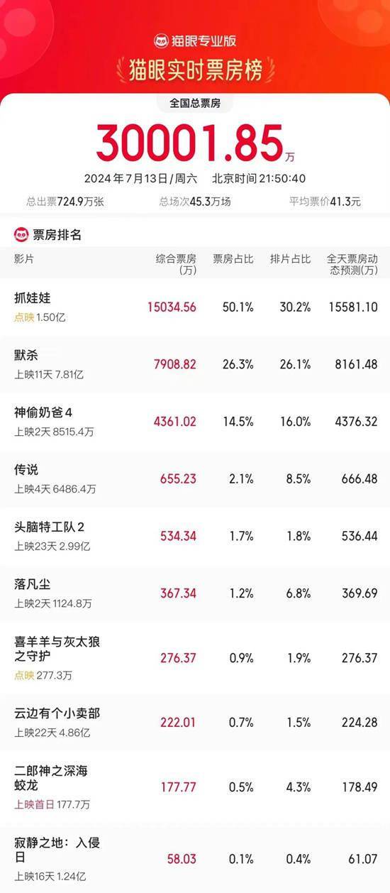 1905电影网专稿据猫眼专业版数据,截至7月13日21时50分,大盘单日票房突破3亿,继2024年5月3日后时隔70天大盘单日票房再度突破3亿。