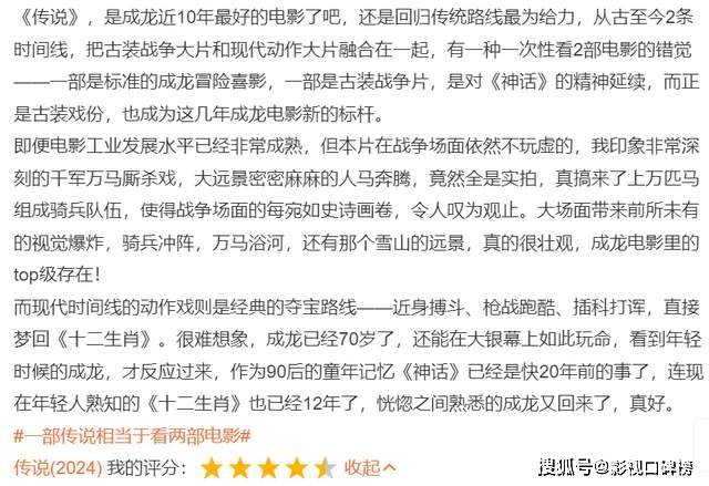 相比之下,差评主要集中在剧情、滥用情怀以及27岁的AI成龙上。作为19年前那部《神话》的姐妹篇,《传说》无论在爱情线还是人设上都没有超越前作,几场爱情戏也没能打动观众。